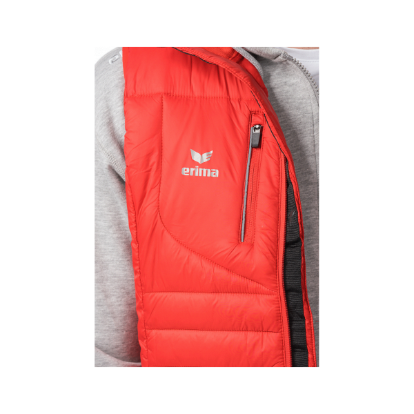 Kołnierz z miękką, żebrowaną wyściółką zwiększa wygodę, a podszyty zamek błyskawiczny z osłoną na podbródek zapobiega podrażnieniom skóry. Praktyczne kieszenie boczne oraz kieszeń na piersi, wszystkie zapinane na suwak, oferują bezpieczne miejsce na niezbędne drobiazgi. Elementy odblaskowe, w tym logo ERIMA na plecach oraz odblaskowe lamówki przy kieszeni na piersi, zwiększają widoczność po zmroku.