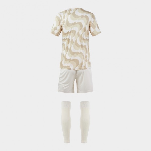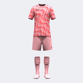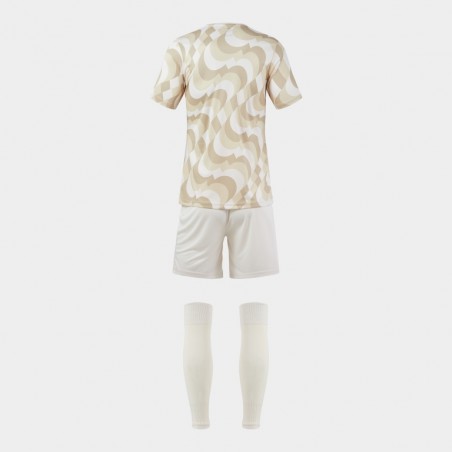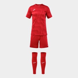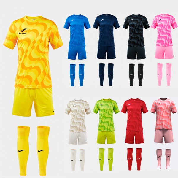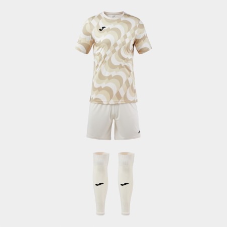 Koszulka z krótkim rękawem, okrągłym dekoltem w bazowym materiale i sublimowanym wzorem. Krótkie spodenki z elastycznym pasem ze sznurkiem wewnętrznym do regulacji dopasowania. Obydwie części zostały wykonane z lekkiego i wytrzymałego materiału odpornego na rozciąganie, co wydłuża ich trwałość. Dodatkowo są oddychające i pomagają w regulacji potu. Skarpety bez stóp wykonane z wygodnego i elastycznego materiału, który odprowadza wilgoć. Wzmocnienie w górnej części ściągacza. Haftowane logo Joma.